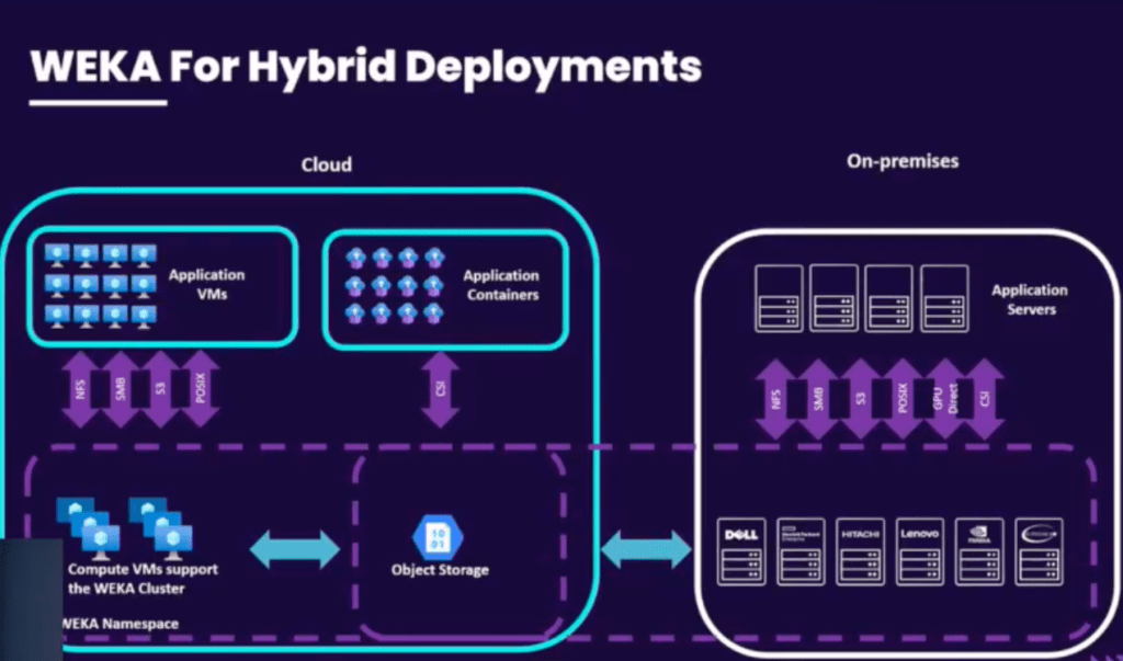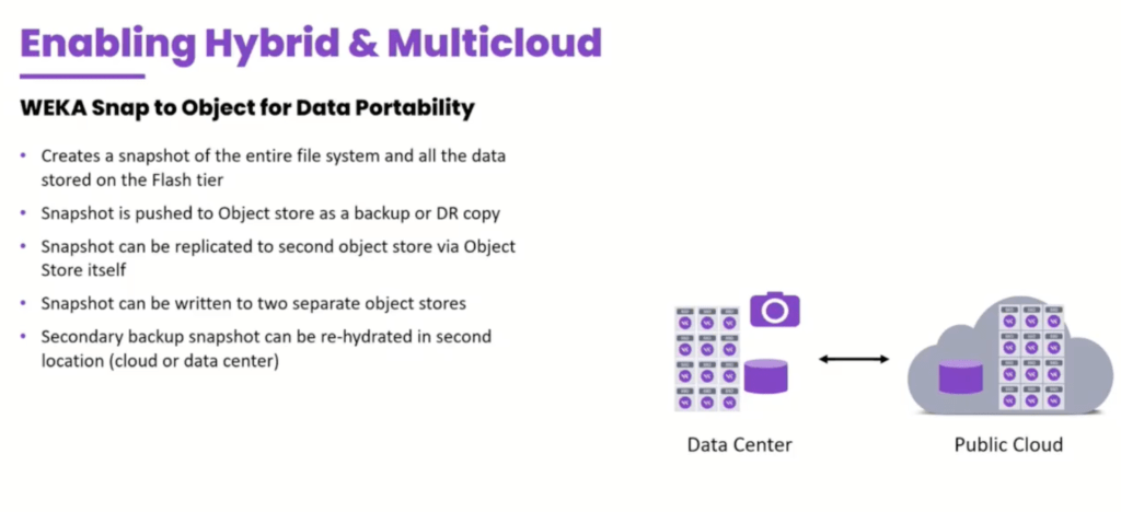 When you need WEKA it stands up and runs the solution needed, but its able to Scale to zero and remove the infrastructure required for the data to be snapped, and then pushed back into on-premises in order to continue working on the data itself.