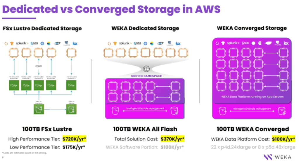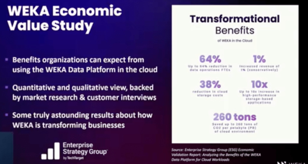 It’s always great to understand the hidden cost to a solution, so I applaud WEKA for including this slide to help us understand what benefits are also hidden with adopting WEKA. WEKA has even created a guarantee for customers that they can cut the infrastructure bill in half for those customers (outcomes may vary).