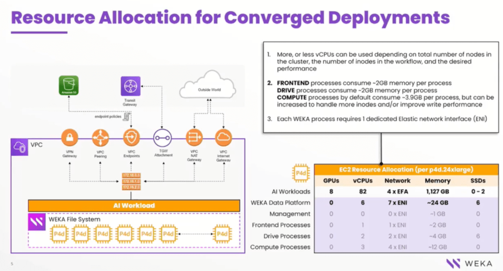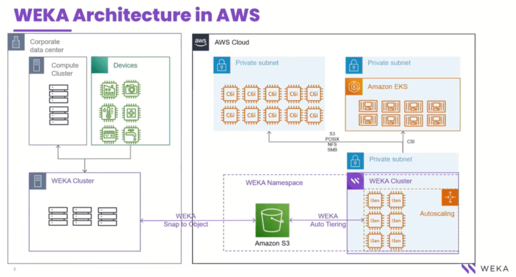 Cluster of I3en servers with autoscaling, however you do not need to utilize bare metal instances in order to use WEKA. WEKA will assist customers in sizing and scaling within their environment and help them understand the total cost of ownership. This also includes networking as it’s a core piece of the network that needs to be validated with the storage needs.