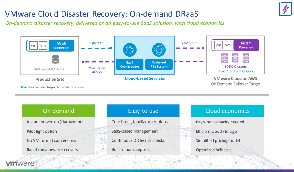 So you may have heard that VMware purchased Datrium a while ago, the question is, what would they use Datrium for? Perhaps the best thing Datrium was used for before they were with VMware, but with VMC on AWS. That’s what we’re seeing today. Disaster recovery as a service allows you to backup your solution and manage it depending on the type of backup you want to use. If your looking at a hot backup, your change rate is kept pretty close to live, so that you can immediately bring up your infrastructure in another location. This is where the migration to and management of VMC’s comes into play, now with the updates in both hybrid cloud solutions. Here is a shot of the solution: