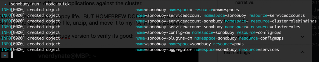 I use a Mac which means I have Homebrew and a happy life. BUT HOMEBREW DOESN’T DOWNLOAD SONOBUOY… c’mon homebrew. So I have to download the file, unzip, and move it to my PATH like a peasant.
