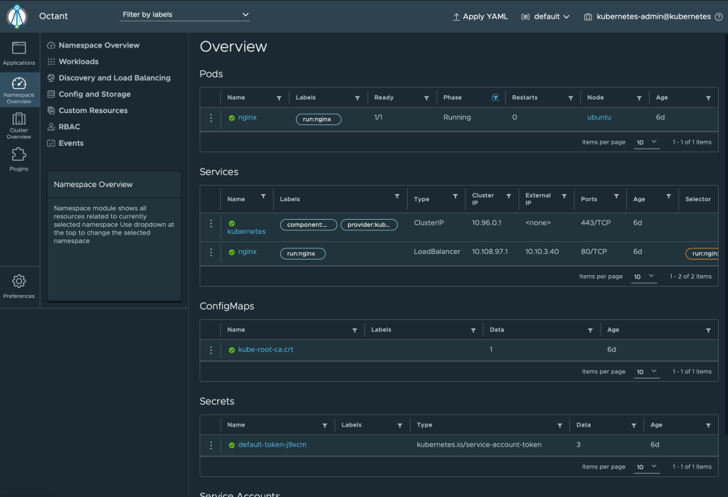 Pretty cool stuff too play around with on one single kubernetes cluster RUNNING ON A SINGLE RASPBERRY PI! True Octant isn’t really running ON the cluster, but it does run some checks within the environment. This can also be done using the kubernetes dashboard found here: https://kubernetes.io/docs/tasks/access-application-cluster/web-ui-dashboard/ but you may run into some KUBECONFIG, or TOKEN errors, so that will be a different blog where we create a God User(to see the process), and then verify the users creds for logging into other areas and doing things. That may be one or two blogs down the pipe. Helm is next. Cause I love package managers.