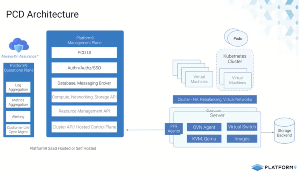 Now looking at the architecture of platform9 PCD the main deployment is SaaS with an agent that calls back to the software. The usage of the self-hosted is limited to the management plane while the other solutions can be utilized outside. The agent can be deployed by normal automation solutions or utilizing manual processes to allow the agent to be installed and deployed.