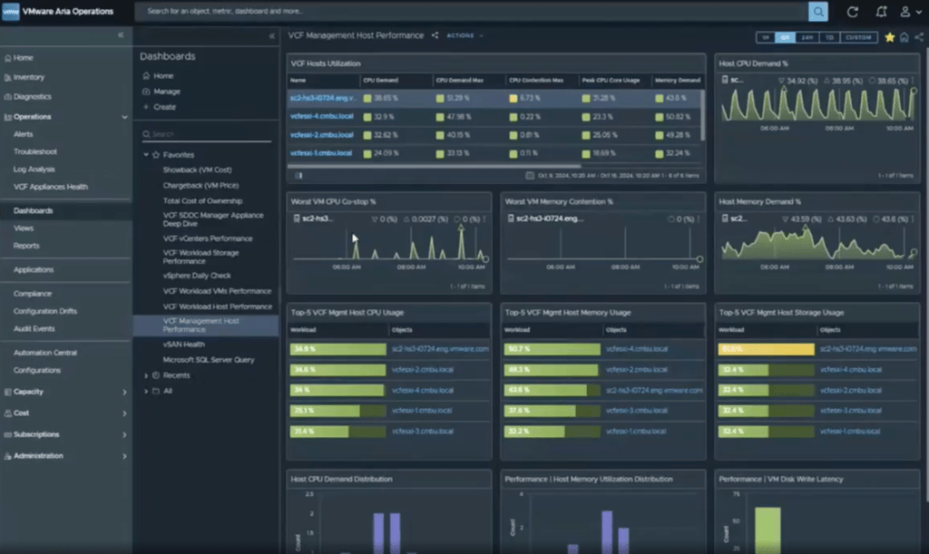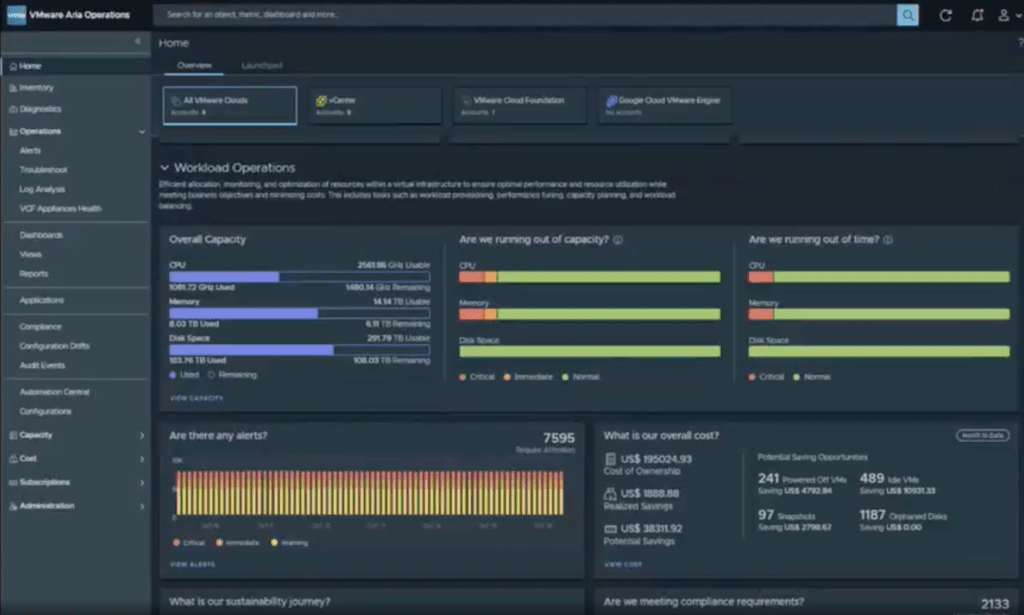 The dashboard provided via Aria Operations shows a quick snapshot on the alerts that need to be investigated, and also things like cost, and capacity. From there you can look into the workbench and dashboards to investigate the requirements of solutions.