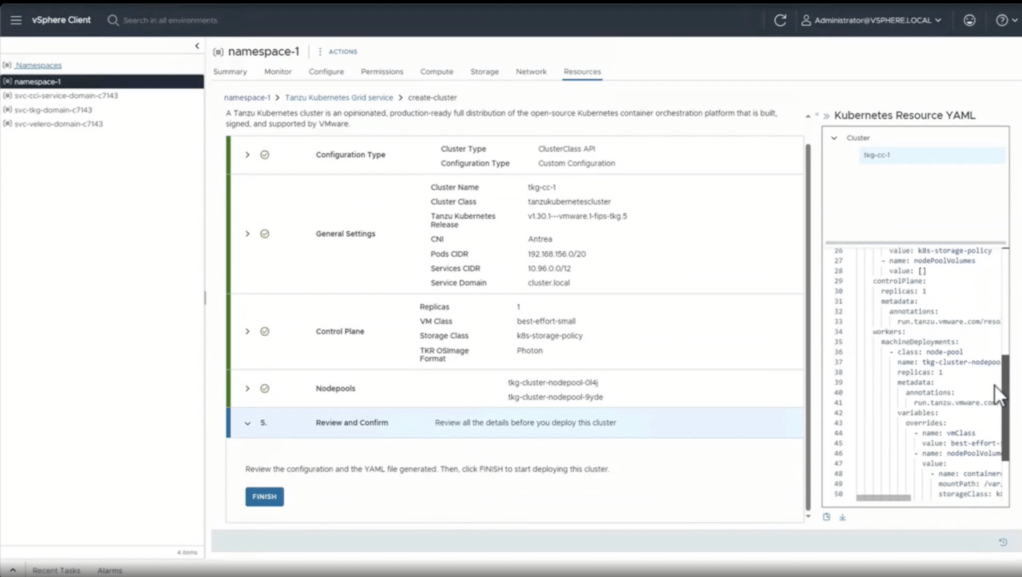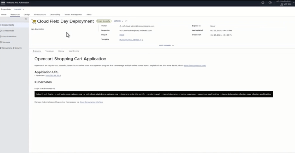 In the above the deployment we saw in the vide we were able to see aria deploy a Kubernetes cluster within a supervisor namespace and then deploy services within Kubernetes. This capabilities have been discussed but this is the first time that I have seen it working. On top of seeing the solution actually build a cluster and the solutions when going into the resource to look at what was built you can then see the command to log into kubernetes.