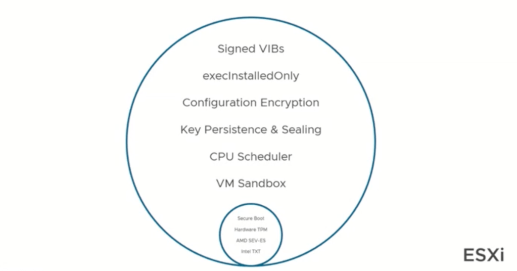 Security out of the box, starts with the box. This is why VMware has been working with a number of providers including CPU manufacturers and other groups in order to enable security and following that there are additional security, like VIBs and what is ran and software ran virtually for the virtualization built upon the box.